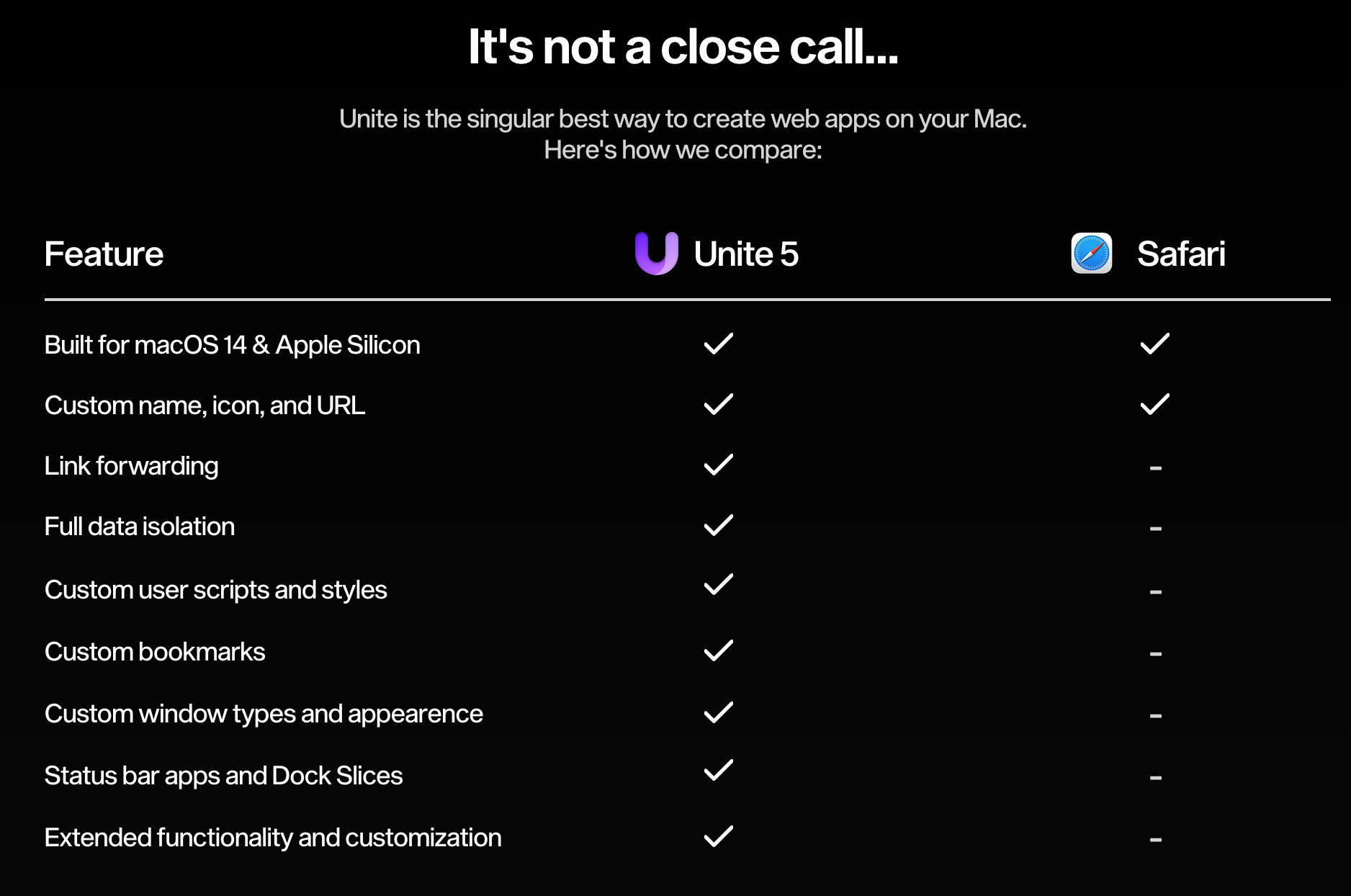 enables users to create native macOS apps from any website, offering the full functionality of a desktop app, including native notifications, dock integration, and customizable app windows, all while maintaining the lightweight nature of web apps
